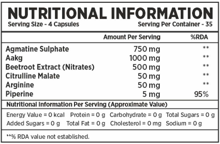Agmatine Sulphate, AAKG, Beetroot Extract (Nitrates), Citrulline Malate, Arginine, Piperine 95%, Vegetarian Capsule Shell (HPMC)